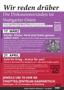 17 Uhr: Stadtteildemonstration (vom Fest aus): Dort kämpfen, wo das Leben ist! Gegen Krieg, Sozialabbau und Rechtsentwicklung! (von der @oa.stuttgart )