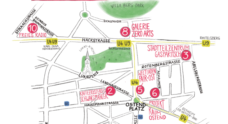 Schlender von Station zu Station und lerne den Osten kennen. In den verschiedenen Locations finden, AUSSTELLUNGEN, LESUNGEN, LIVEKONZERTE, VERKOSTUNGEN, KUNSTPROJEKTE, KAFFEERÖSTEREI, FRÜHSTÜCK, OUTDOOR-DART, SINGEN uvm mehr statt. Das ein oder andere Kaltgetränk so wie Speisen dürfen natürlich nicht fehlen.