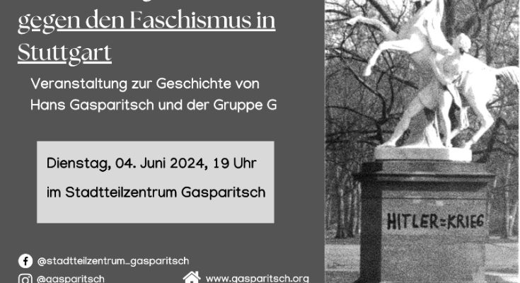 Am 14. März 1935 pinselte der damals 17-jährige Schriftsetzerlehrling Hans Gasparitsch neben „Rotfront“ die Parole „Hitler=Krieg“ auf die Sockel der Rossebändiger-Statuen im Stuttgarter Schlossgarten. Dies geschah im Rahmen von Aktionen der Gruppe G – einer Gruppe von Jugendlichen, die Widerstand gegen den Faschismus in Stuttgart und der Region organisierten. Einige Mitglieder der Gruppe G wurden im Zuge der Aktion verhaftet – darunter auch Hans Gasparitsch. Er verbrachte zehn Jahre in Haft und überlebte in den KZs Dachau, Flossenbürg und Buchenwald. Hans Gasparitsch kam zurück nach Stuttgart und engagierte sich bis zuletzt gegen Faschismus, Rassismus und für eine bessere Welt.